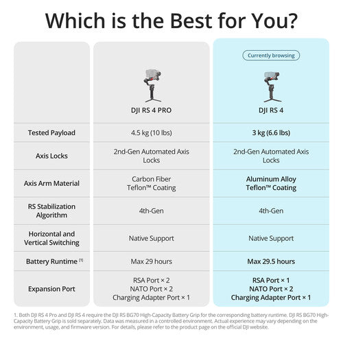 Enhanced operation efficiency, native vertical shooting, and an expanded accessory ecosystem make the DJI RS 4 Gimbal Stabilizer Combo a powerful tool for the mirrorless camera shooter. The gimbal only weighs around 2.4 lb and sports a load capacity of 6.6 lb capable of supporting your compact camera build. The combo includes a Focus Pro Motor with a rod mount kit, a focus gear strip, a briefcase handle, and a carrying case. Teflon-coated axes reduce friction for a smoother balancing and operating experience. Other intuitive features include a fine-tuning knob, auto-locking OLED screen, and RSA communication port for use with expanded accessories.