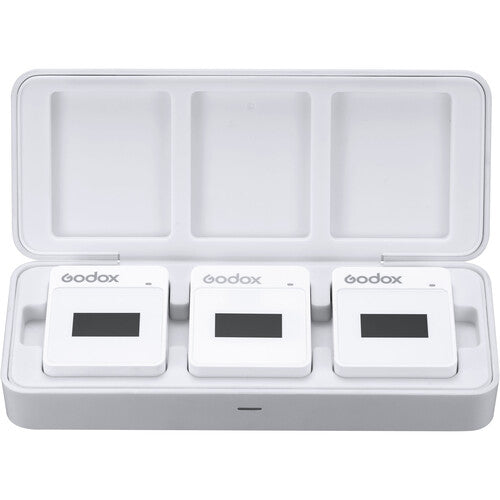 The white MoveLink II M2 from Godox provides an easy-to-use and cost-effective entry into the world of hands-free wireless audio for a wide variety of content creators, including YouTube and TikTok personalities, vloggers, mobile journalists, and more. The system offers two ultracompact clip-on microphone/transmitters, two lavalier mics, and a two-channel camera-mountable receiver to provide a portable, all-inclusive solution that lets you record a subject's audio to a camera or phone with a 3.5mm input jack.