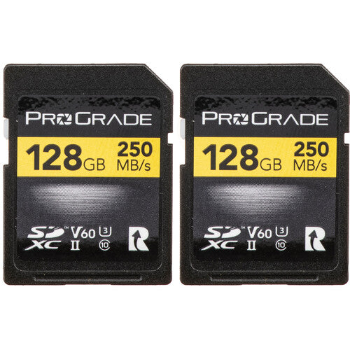 The 128GB UHS-II SDXC Memory Card (2-Pack) from ProGrade Digital features a storage capacity of 128GB per card and takes advantage of the UHS-II bus to support maximum read speeds of 250 MB/s and maximum write speeds of 130 MB/s. This card has also been designed with the V60 Video Speed Class rating, which guarantees minimum write speeds of at least 60 MB/s, allowing the card to be used in DSLRs, mirrorless cameras, camcorders, and digital cinema cameras to produce 4K, UHD 4K, 3D, Full HD, and high bit rate MPEG-4 video. It is also well suited for raw photos and rapid-fire bursts.