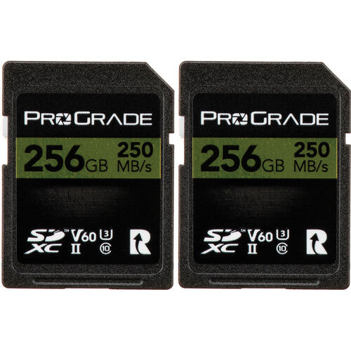The 256GB UHS-II SDXC Memory Card (2-Pack) from ProGrade Digital features a storage capacity of 256GB per card and takes advantage of the UHS-II bus to support maximum read speeds of 250 MB/s and maximum write speeds of 130 MB/s. This card has also been designed with the V60 Video Speed Class rating, which guarantees minimum write speeds of at least 60 MB/s, allowing the card to be used in DSLRs, mirrorless cameras, camcorders, and digital cinema cameras to produce 4K, UHD 4K, 3D, Full HD, and high bit rate MPEG-4 video. It is also well suited for raw photos and rapid-fire bursts.